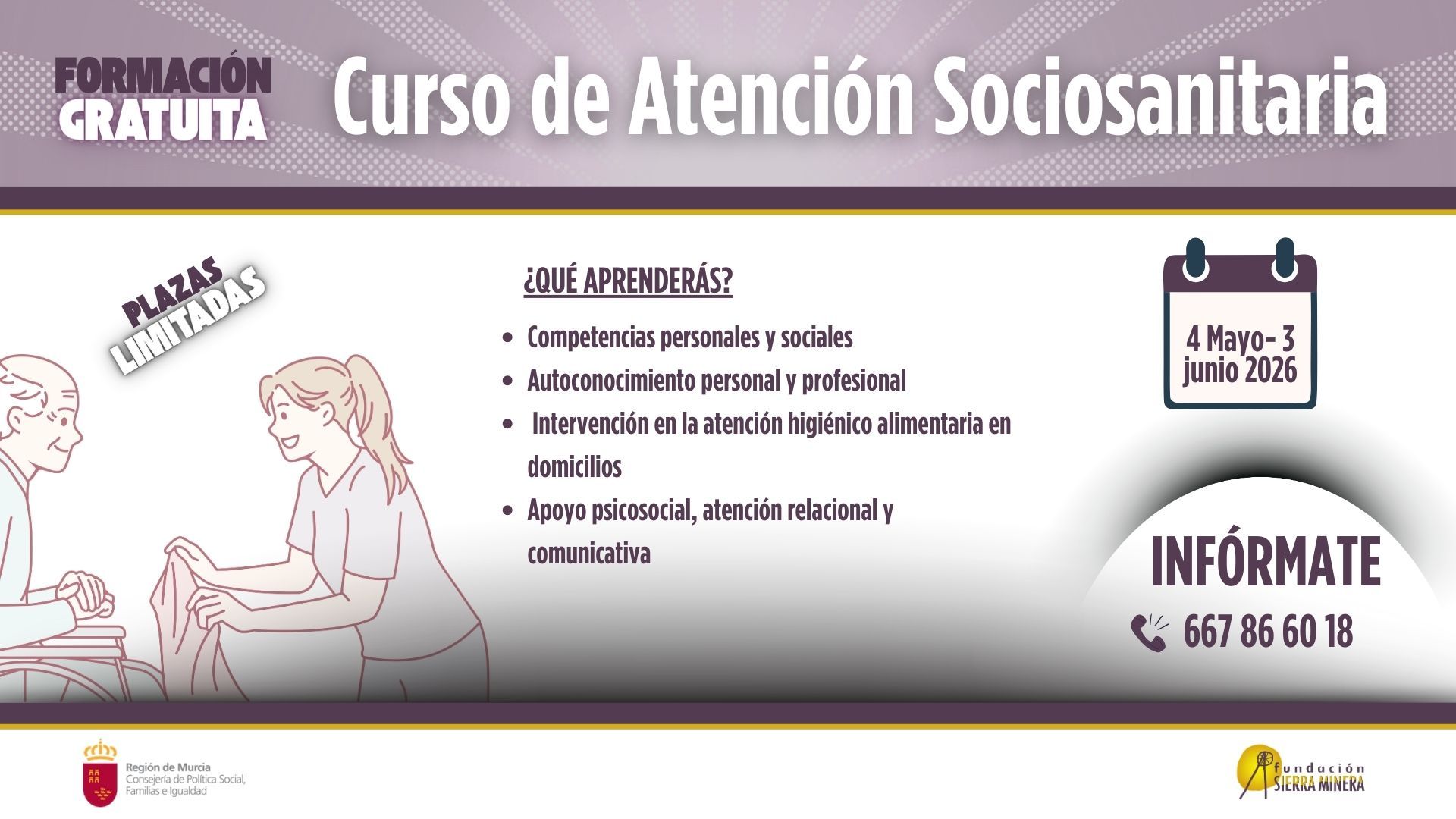 Fundación Sierra Minera ha abierto el plazo de inscripción para el Curso de Atención Sociosanitaria a personas dependientes en domicilios, una formación gratuita dirigida principalmente a personas desempleadas con dificultades en el idioma, interesadas en mejorar su empleabilidad en el ámbito de los cuidados.