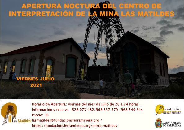 Para realizar la visita nocturna a la mina se recomienda reserva previa en los teléfonos del Centro de Interpretación: 628 073 482 / 968 537 570/ 968 540 344 o en el correo electrónico lasmatildes@fundacionsierraminera.org.