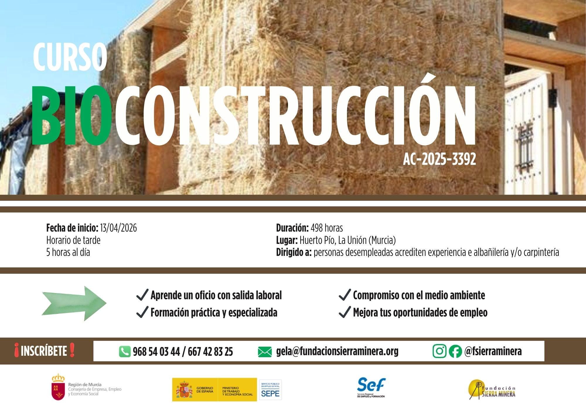BIOCONSTRUCCION, curso, empleo, formación, Fundación Sierra Minera, Huerto Pío, medioambiente, nuevo, SEF, sostenible